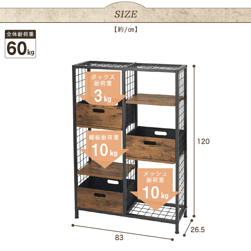 商品仕様 商品シリーズ オープンシェルフ ラスティア 幅80 高さ120 外形寸法 幅83×奥行26.5×高さ120cm 耐荷重 全体60kg、メッシュ棚10kg、木棚10kg、ボックス3kg 重量 15.4kg 内容明細 サイドフレーム×2、センターフレーム×1、メッシュ棚×2、アジャスター×4、ネジ×12、六角レンチ×1、木棚×4、ボックス×3、底板(ボックス用)×3 材質 本体:メッシュ棚・フレーム/スチール(エポキシ樹脂塗装) 木棚/プリント紙化粧パーティクルボード ボックス:表面/合成樹脂化粧繊維板・ポリエステル、芯材/板紙 型番 RT8012-OP JANコード 4550084153933 メーカー 株式会社ドウシシャ インフォメーション 複数便配送について 商品によって出荷される倉庫が異なるため、一度に複数の商品をご購入いただいたお客様には、商品ごとのお届けが別便となる場合があります。
