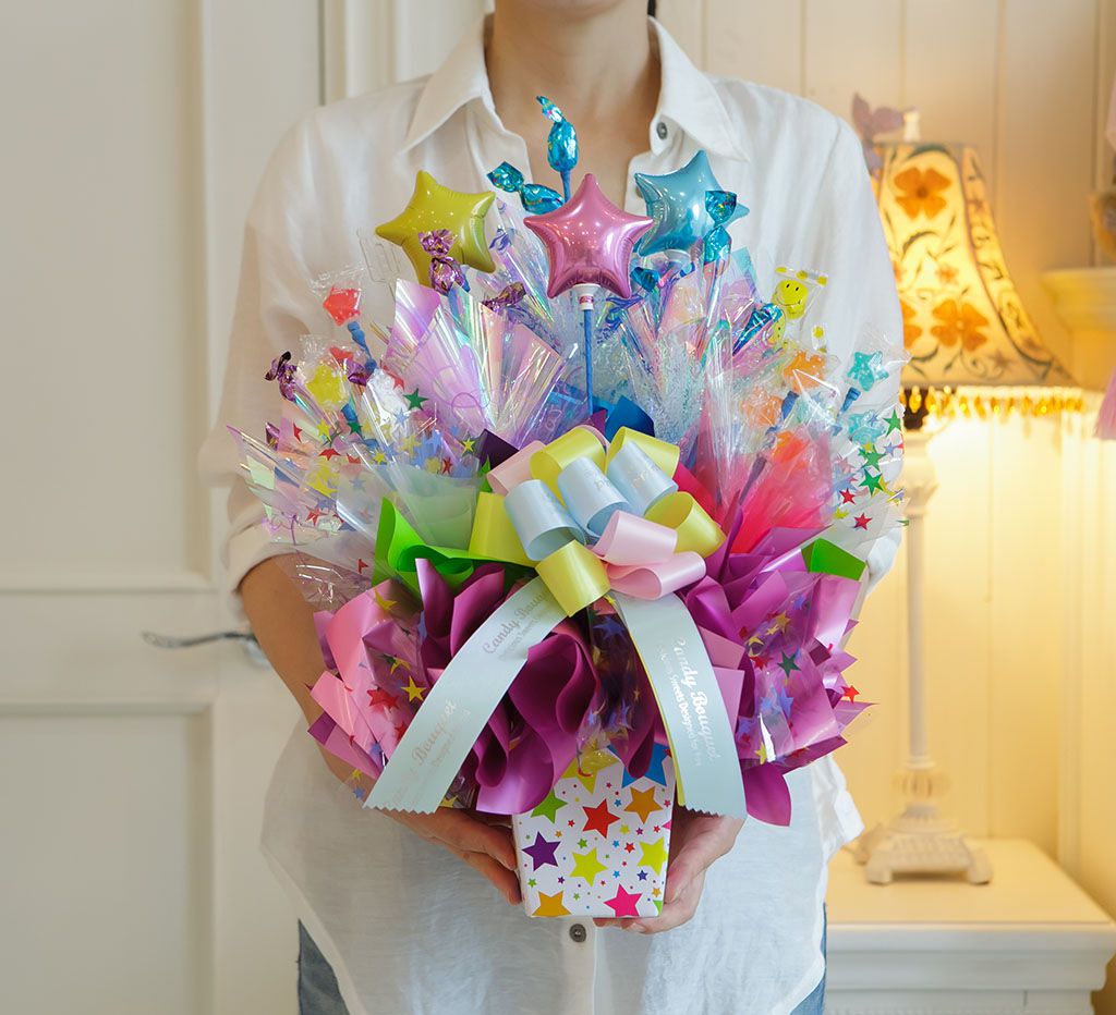 星にかこまれて・・・癒されちゃいます! 内容 チョコ12個 キャンディ18個 サイズ 高さ490×横360×奥行き300mm 賞味期限 1ヶ月以上〜 原産国 日本 保存方法 高温多湿をお避け下さい キャンディブーケに利用するキャンディ・チョコレートは、季節や在庫状況により変わる場合もございます。